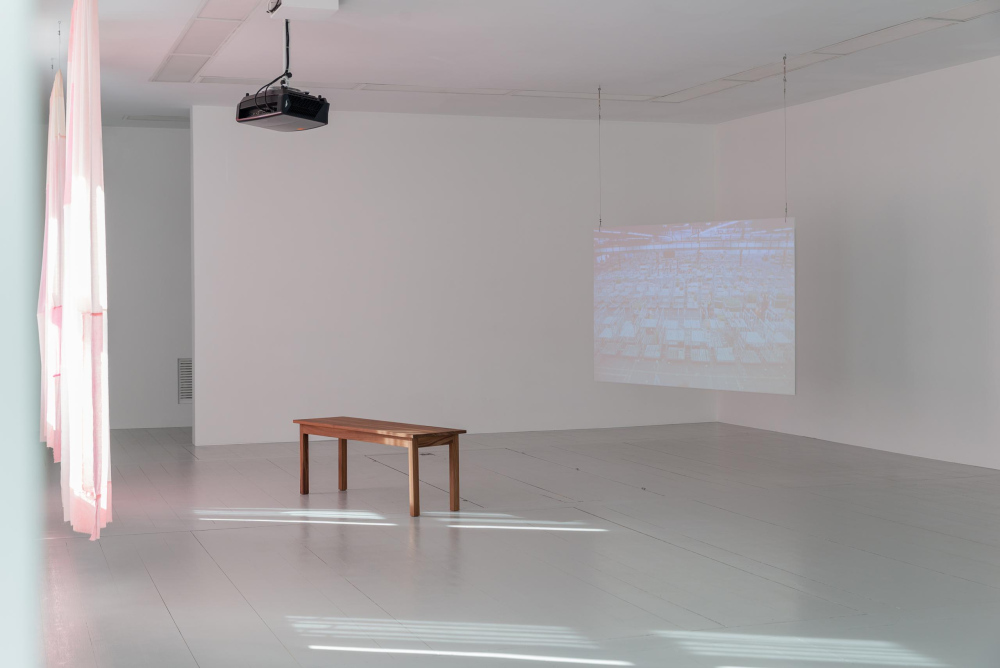 Light, and how it affects not only people but also other creatures and materials, is a central component in many of Serné's works, both thematically and formally. Several of the works she shows in Nightblooming are created using light: footage shot on 16mm film show the warehouses in the Netherlands, where forklifts loaded with flowers drive in seemingly endless, hypnotic circuits. Textile works in wool and silk, hung in front of the windows of the gallery space, carry the imprint of the morning sun. The materials were treated with a substance that made them light-sensitive, before being exposed at sunrise.