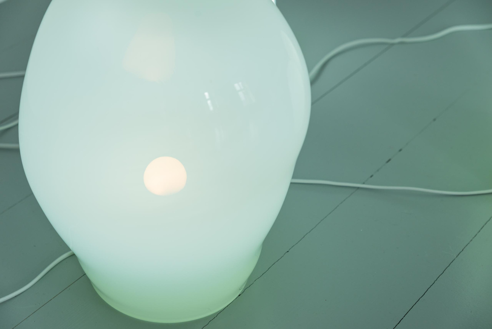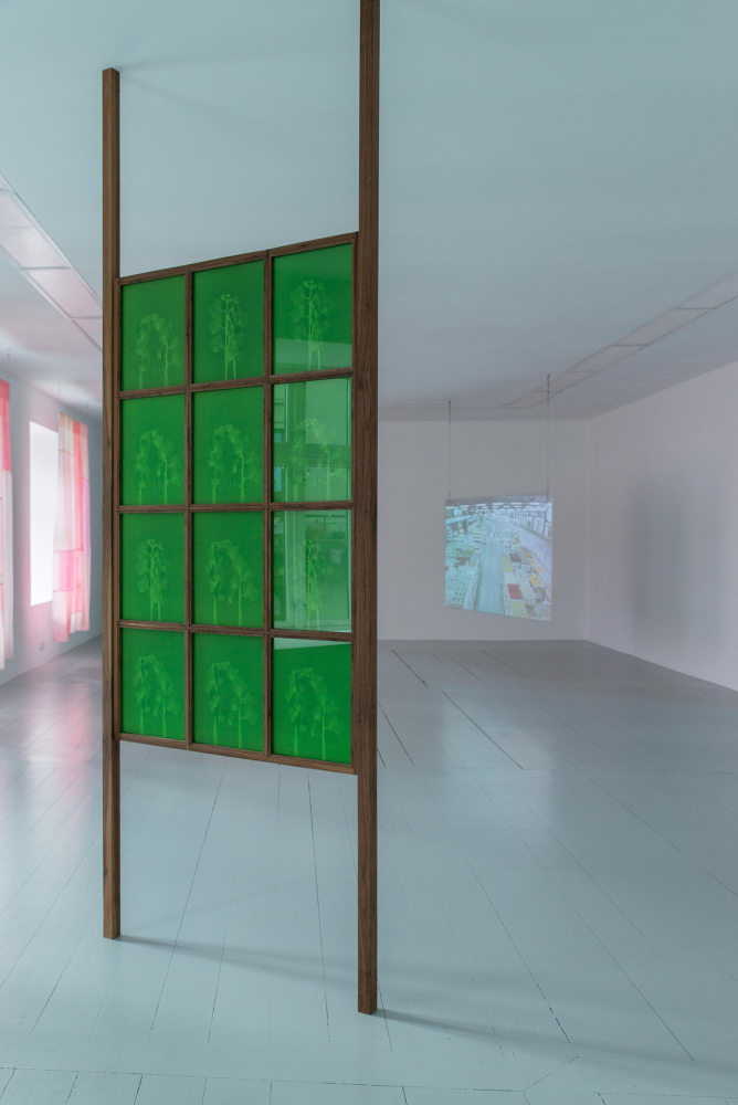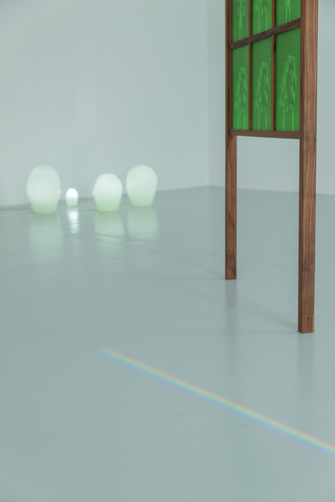 Serné often works with textiles and photographic media. In the exhibition at Hordaland Kunstsenter, glass is also an important material. Silk-screen prints on glass in shades of green are illuminated by daylight and wash colour across the gallery space. Handblown green glass sculptures are lit from within by light bulbs.