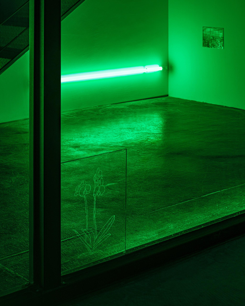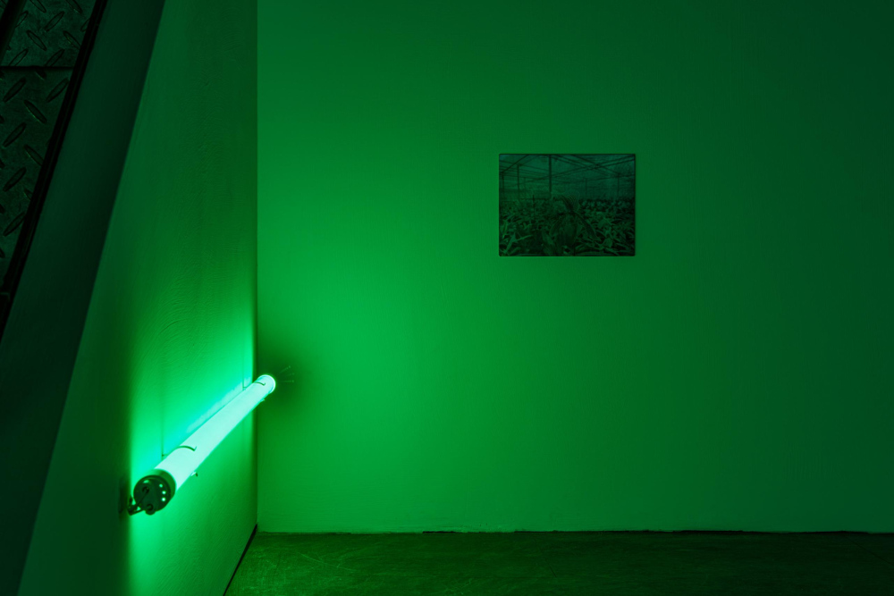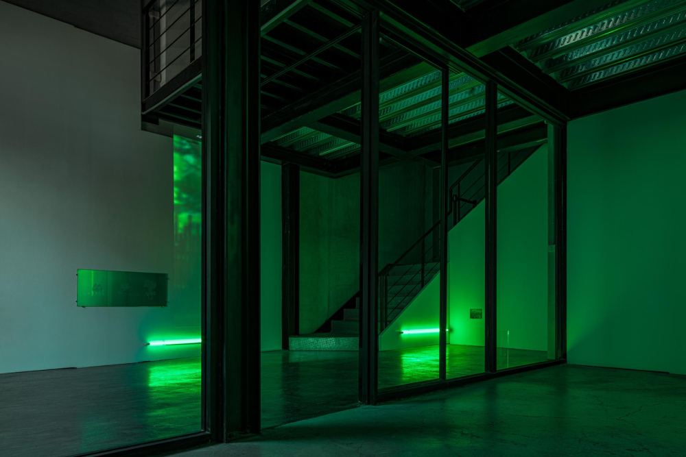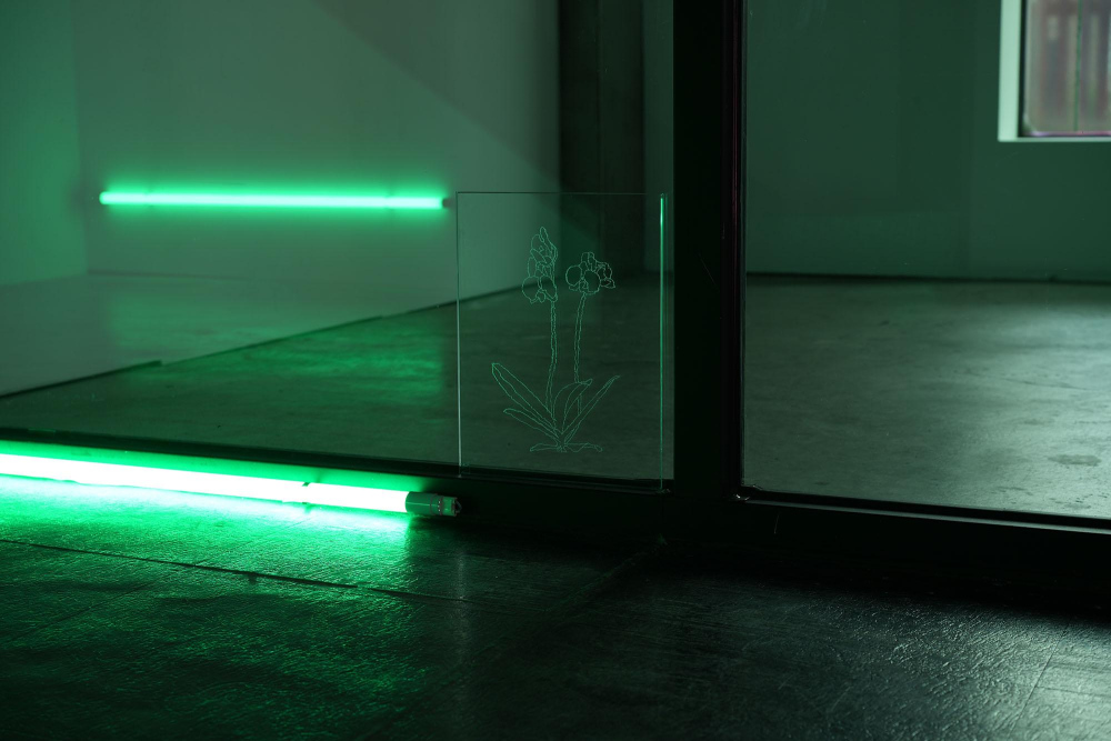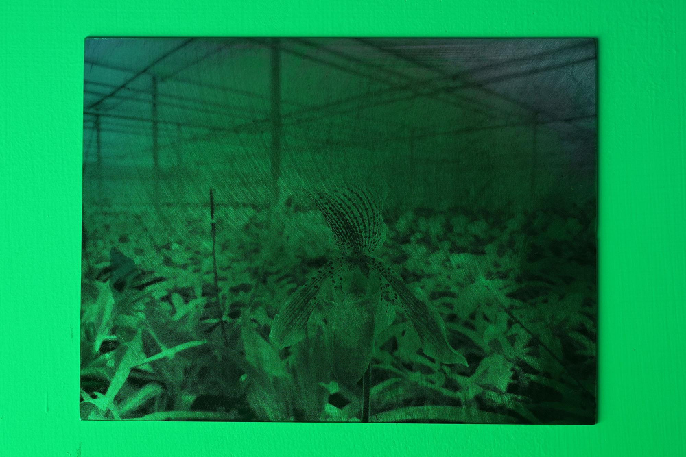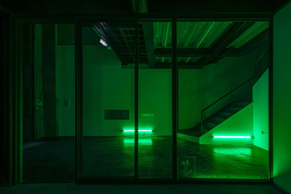 hour, flower grew out of a visit to an orchid nursery in Taiwan, tracing the global passage of flowers under manipulated light and the day–night cycles of humans and plants. The space had varying light conditions throughout the day and early evening.