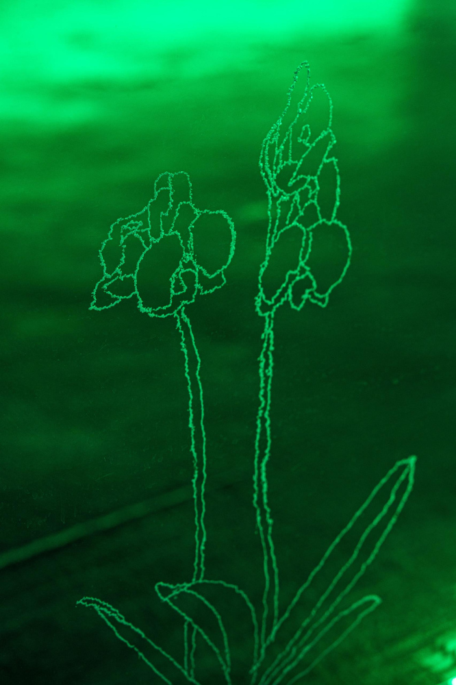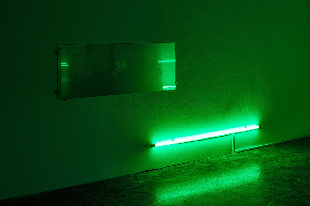 "A very long bed, circadian rhythm", engraved glass, neon lights, transformers, cables