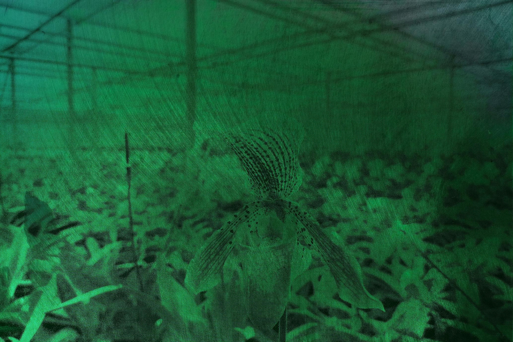 The works in the exhibition hour, flower grew out of a visit to an orchid nursery in Taiwan, tracing the global passage of flowers under manipulated light and the day–night cycles of humans and plants. The space had varying light conditions throughout the day and early evening.